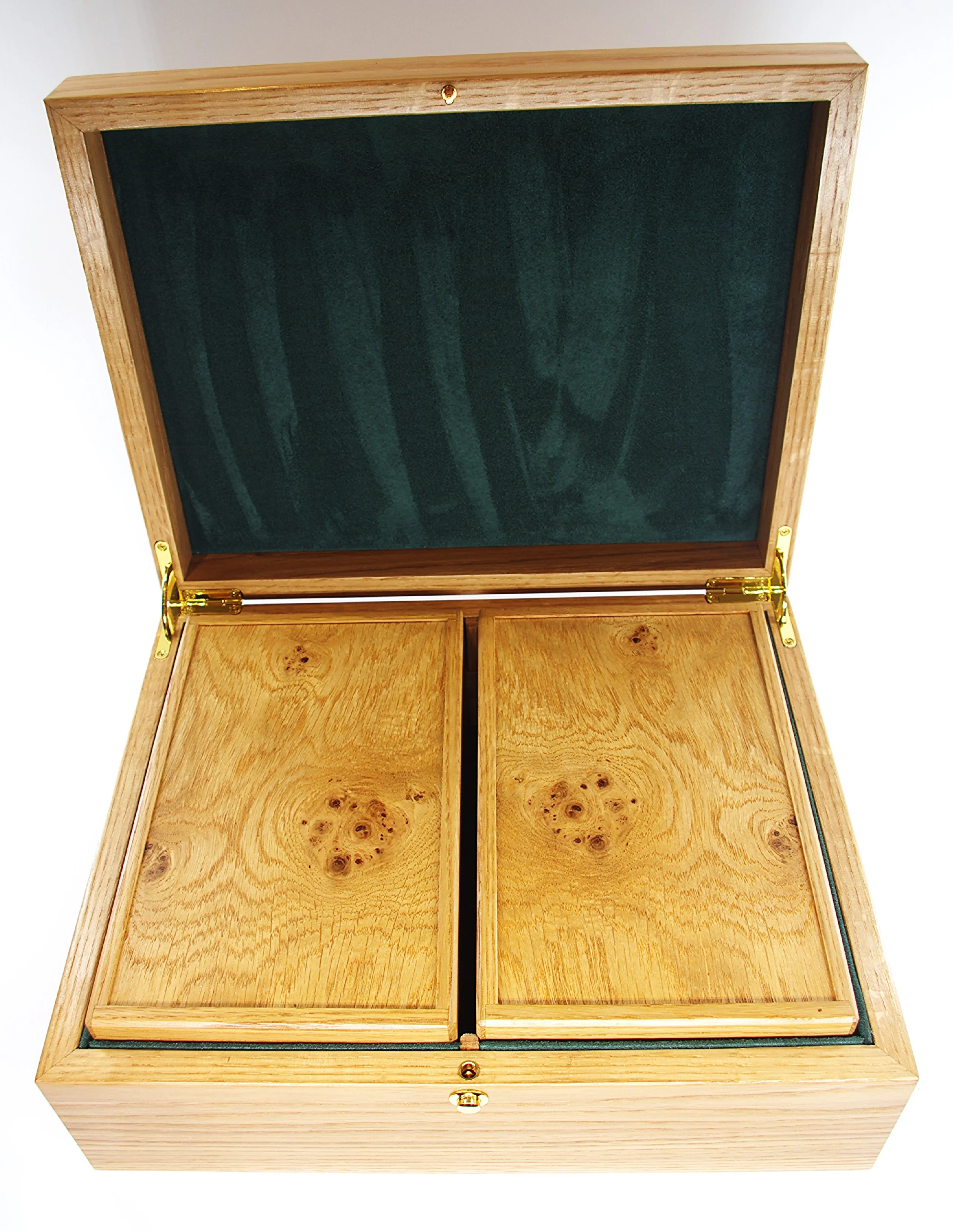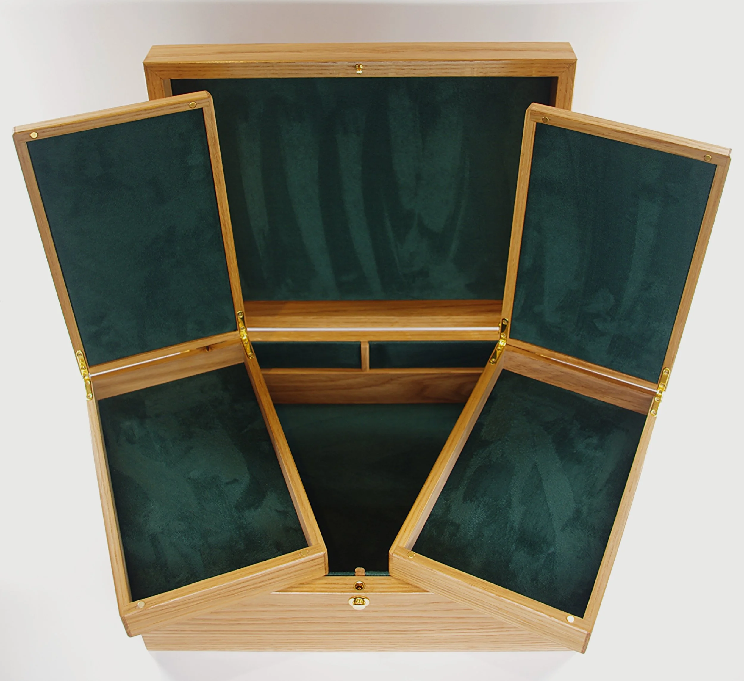 Sitting above the bottom tray are two smaller Oak boxes with book matching tops to hold those special smaller items safely.